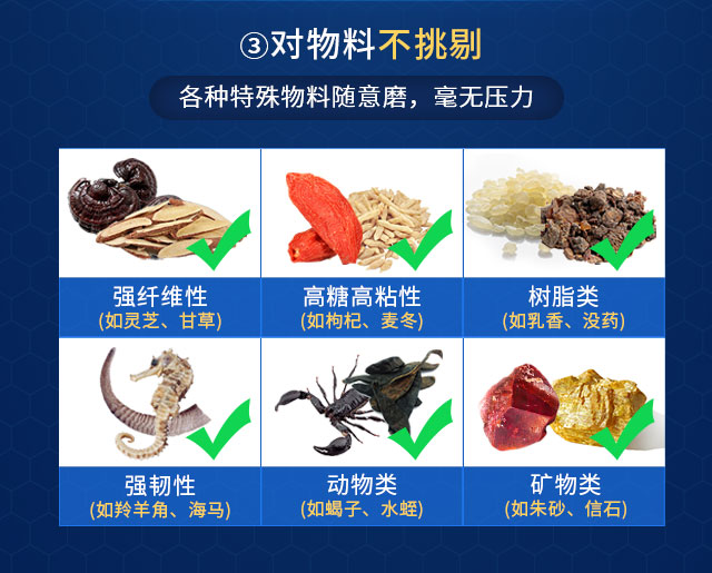 1、強(qiáng)纖維性(如靈芝、甘草);2、高糖高粘性(如枸杞、麥冬);3、樹脂類(如乳香、沒(méi)藥);4、強(qiáng)韌性(如羚羊角、海馬);5、動(dòng)物類(如蝎子、水蛭);6、礦物類(如朱砂、信石)。