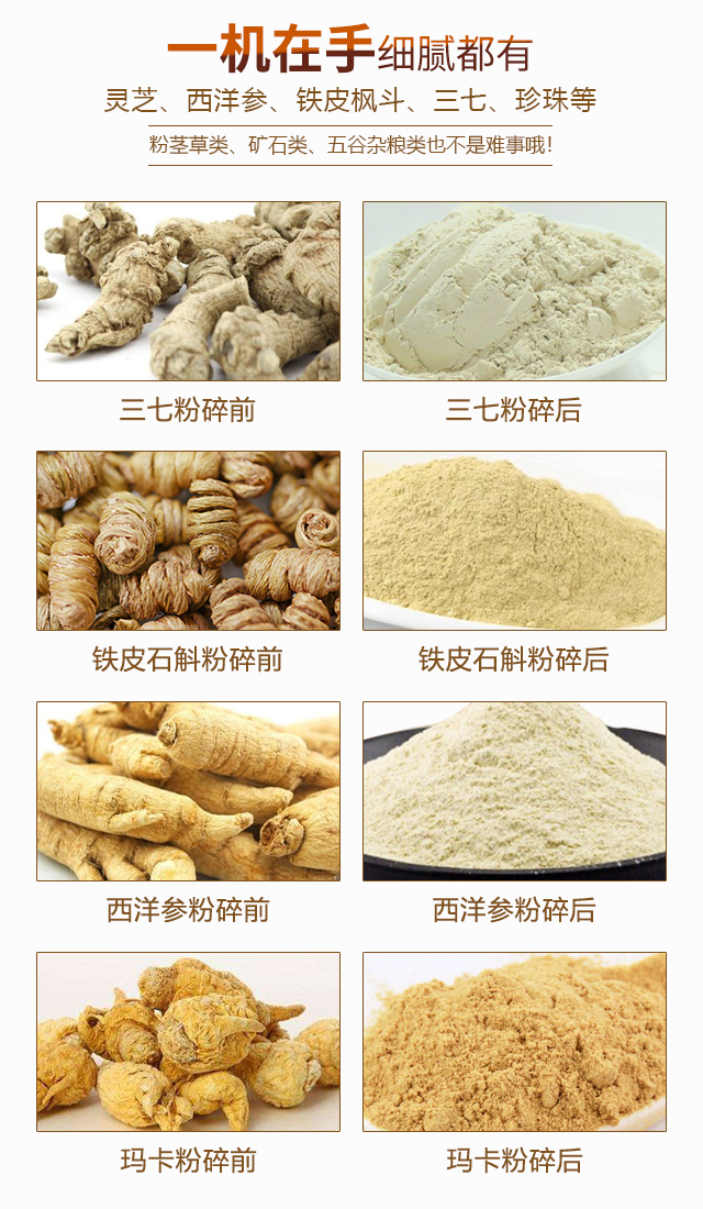 第二點(diǎn)也是選擇粉碎機(jī)的關(guān)鍵主要是細(xì)度和產(chǎn)量,您粉碎中藥以后的用途是什么!中藥制丸,裝膠囊,壓片,直接沖服,制作膏藥或者科學(xué)研究用,根據(jù)自己的用途選擇中藥粉碎機(jī)才能夠避免落入宣傳誤導(dǎo)導(dǎo)致一味的追求細(xì)度忽略了產(chǎn)量,效果等,而且還會(huì)花很多冤枉錢(qián),畢竟粉碎機(jī)的行業(yè)特點(diǎn)就是粉碎細(xì)度越高產(chǎn)品價(jià)格越高。就拿中藥制丸來(lái)說(shuō),中藥粉碎機(jī)成60-100目的粉其實(shí)已經(jīng)足夠,這種細(xì)度要求普通的粉碎機(jī)完全可以達(dá)到,如果zui近很暢銷(xiāo)的PLS系列超微粉碎機(jī),采用研磨粉碎方式,對(duì)于任何纖維狀、高韌性、高硬度及含水量小于6%的物料均可適應(yīng),能耗低溫度低,避免發(fā)生物料高溫氧化、變質(zhì)和有效成分的損失和偏折。粉碎過(guò)程全密閉,真空狀態(tài),無(wú)粉塵衣櫥,充分改善作業(yè)環(huán)境。